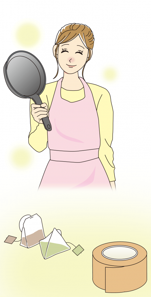 ●フライパンの予洗いにはお茶のパックがおすすめ…油ギトギトのフライパンをそのままスポンジで洗うと、スポンジまで油ギトギトになり、2度洗いが必要なことも。そこで、まだ温かいうちにキッチンペーパーなどで油を軽くふき取ります。フライパンが冷めたら、使用後の紅茶などのティーバッグや麦茶のパックでぬるま湯を出しながら軽くフライパンをなでると、油がある程度落ちて、その後の洗いがラク。スポンジの油汚れも回避できます。