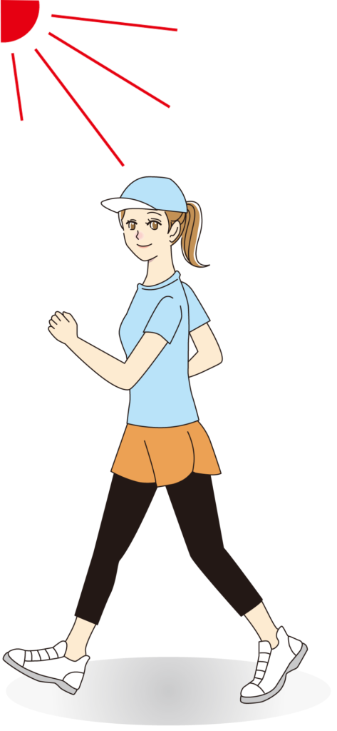 ウォーキングなら1回30分、ジョギングは1回15分、どちらも週5回が目安です。朝や夕方など、気温が日中より低い時間帯がおすすめです。帰宅時にひと駅分歩く、外出時にできるだけ階段を使うなど、日常の中で、歩くことを意識するのも良いですね。